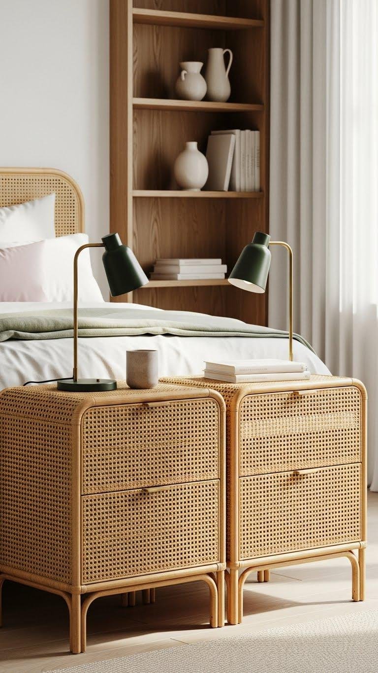 Woven-rattan nightstands bring instant texture and warmth to a spring bedroom, grounding airy linens with natural, tactile appeal. You’ll create a breezy, unconfined vibe by pairing them with minimalist lamps and open shelving.
