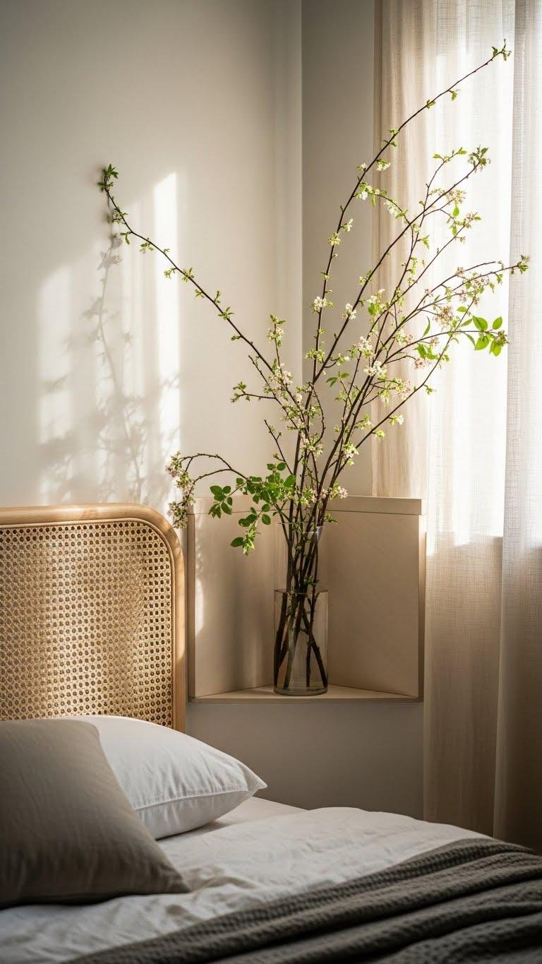 After you’ve anchored the bed with a lightweight cane headboard, introduce fresh spring branches to bring height, movement, and a burst of seasonal life into the room.