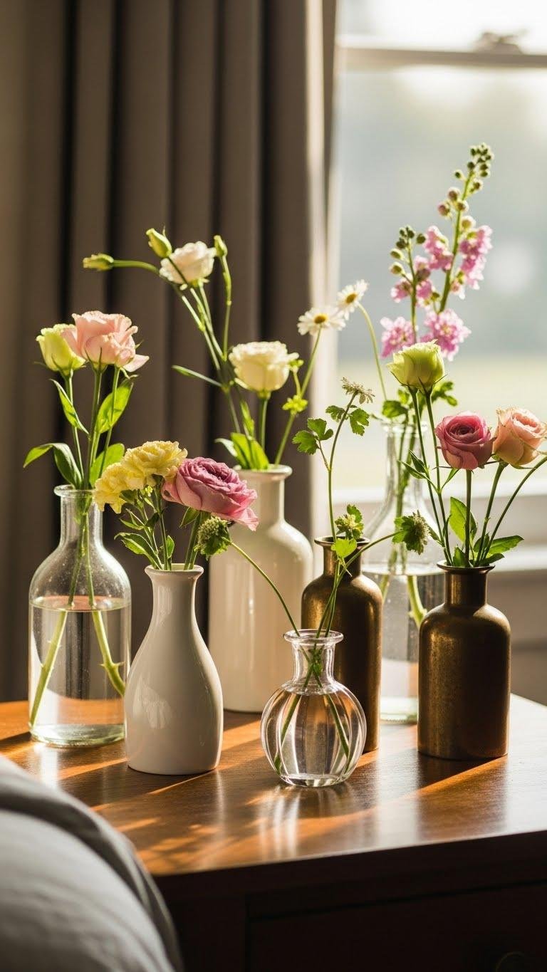 Cluster a few small vases of varying heights across a bedside table or dresser to give your room a curated, magazine-ready feel. Mix seasonal stems and budget blooms—single stems in glass, ceramic, or brass—to create airy groupings. You’ll keep things loose, swapping blooms with the season.