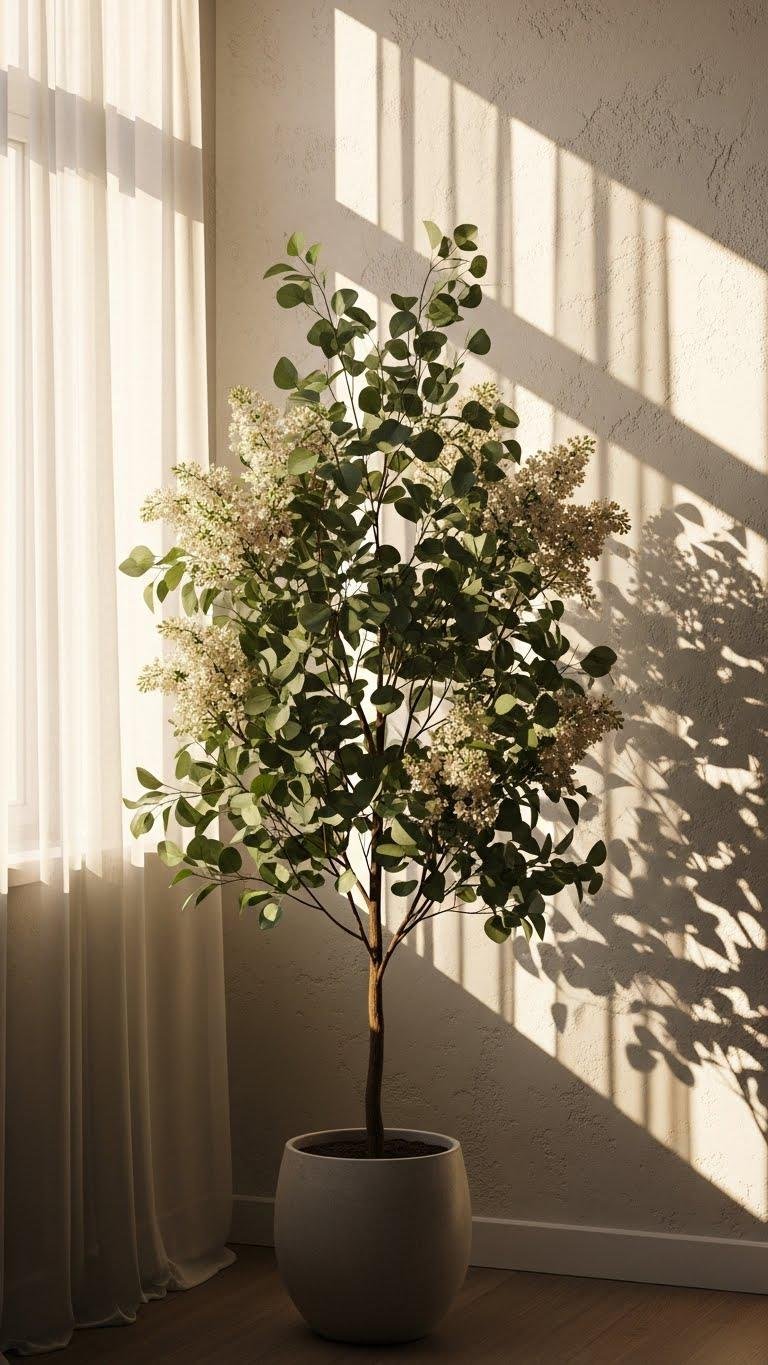 If you liked the effortless look of single-stem vases, scale up with a potted eucalyptus or lilac to add height, texture, and a living focal point. You’ll place it near a sunny window, letting scent and soft foliage breathe life into your room.