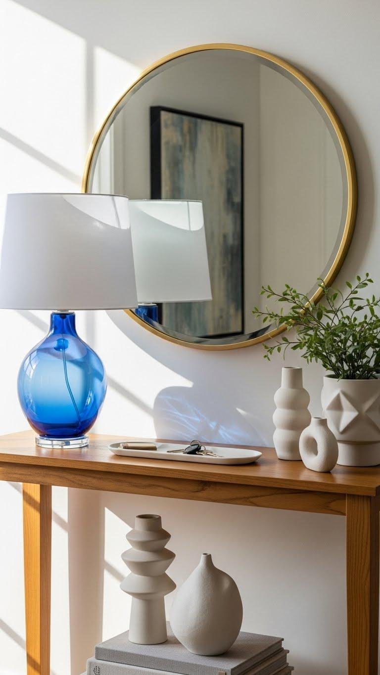 Though simple in silhouette, the Everett console becomes a statement when topped with a blue glass lamp and a round gold mirror—together they add depth, color, and reflective warmth to your entry. You’ll pair the blue lamp’s cool clarity with sculptural ceramics, a slim tray for keys, and airy greenery. The gold mirror amplifies light, invites guests, and keeps the vignette feeling free and intentional.