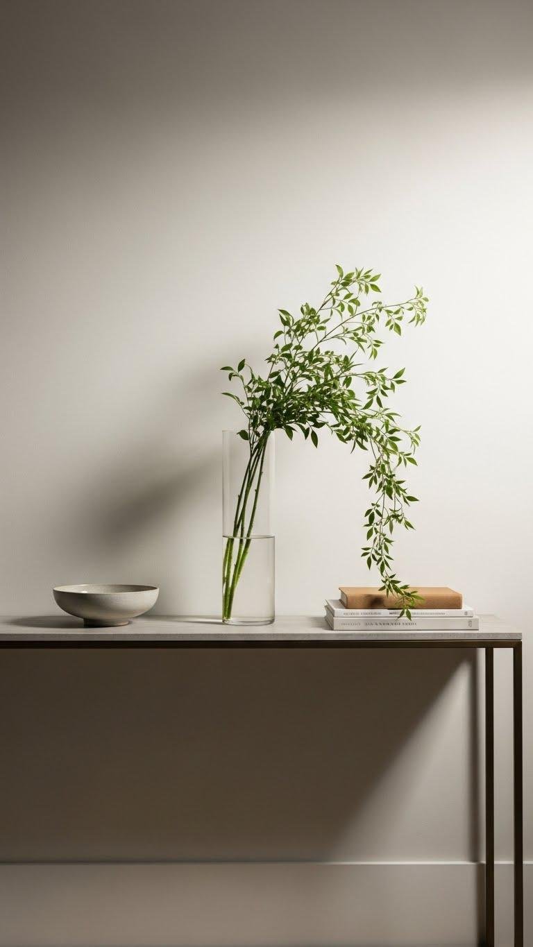 Keep surfaces uncluttered, rotate seasonal accents, and let this minimalist vignette breathe so coming and going feels effortless and free.