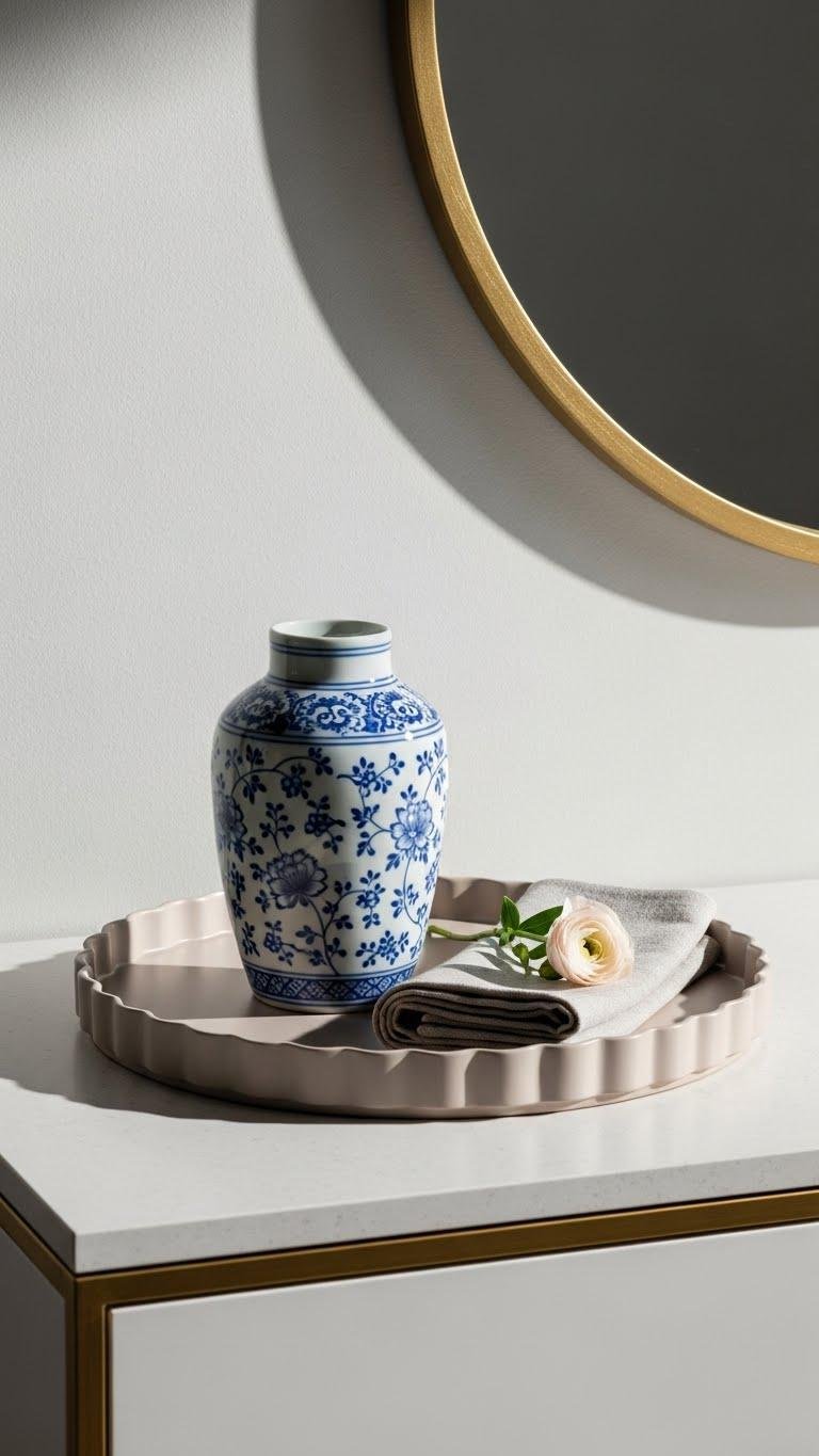 A scalloped tray brings instant polish to your entryway, cradling a blue-and-white vase that reads like a small, artful punctuation.