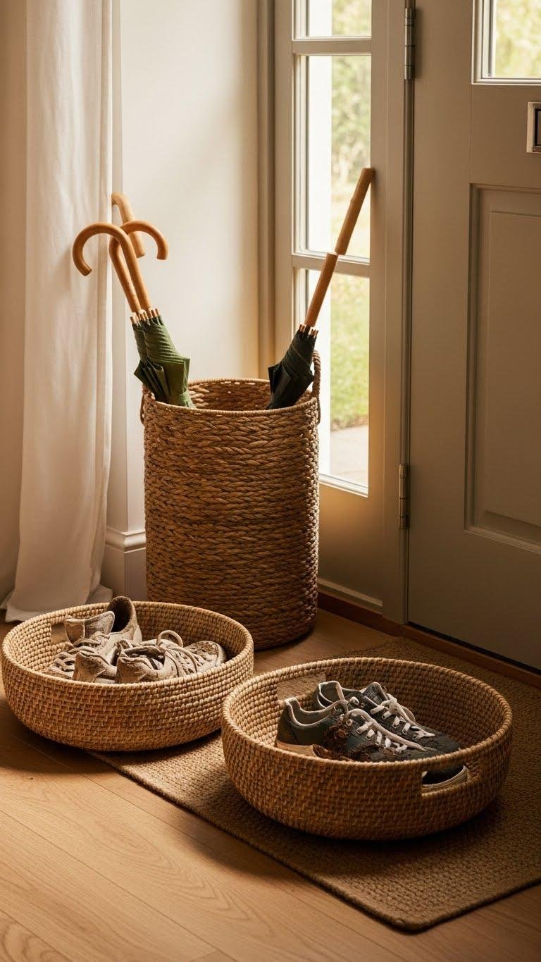 You’ll tuck muddy sneakers into low baskets for tidy shoe storage and stand a taller weave by the door as an elegant umbrella holder.