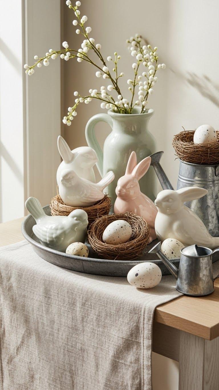 Bring out a few well-chosen bunnies, birds, and eggs to add instant spring charm to your entryway; their small scale and soft shapes create a welcoming, curated vignette without overwhelming the space. Place porcelain birds, matte bunnies, and speckled eggs on a tray with vintage nests and miniature watering cans for contrast. Let each piece breathe so your display feels free, intentional, and calm.