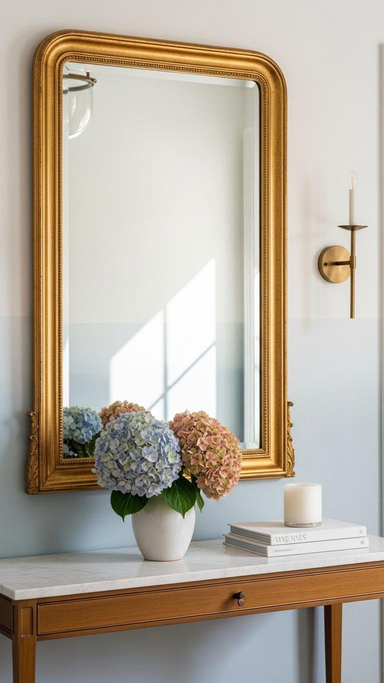 Gold Mirror Above Console With Hydrangeas