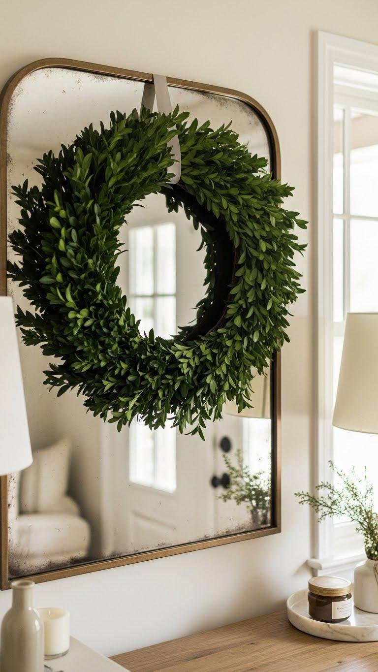 Boxwood Wreath Hung on a Mirror