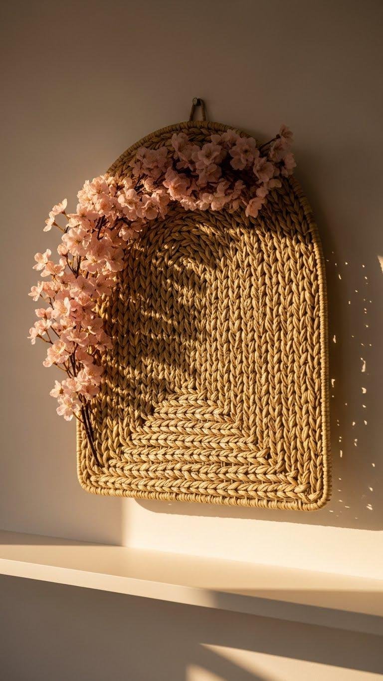 A woven arch wall basket with pink blossoms instantly lifts a shelf vignette by combining texture, shape, and a soft pop of color—you’ll get natural warmth from the handwoven fibers and a fresh, modern look from the blush floral accents.
