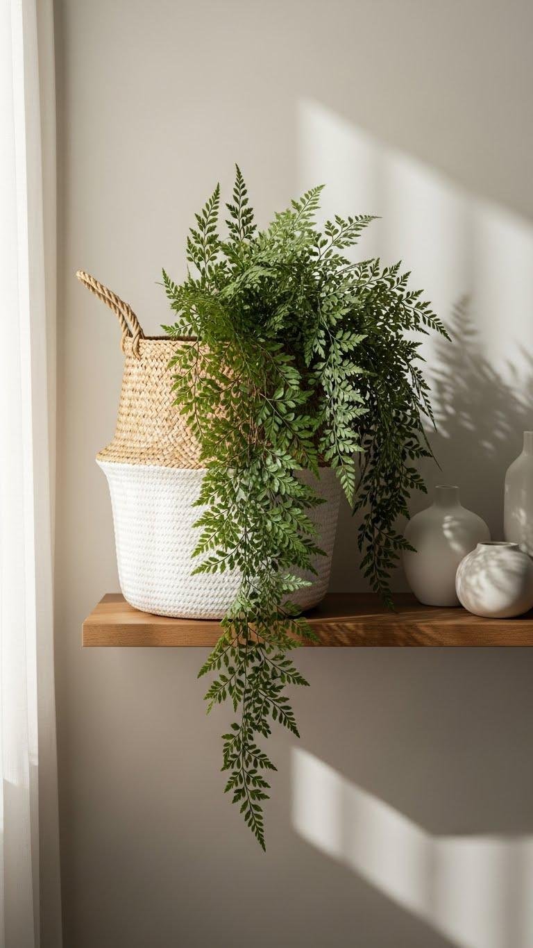 Often you’ll lean on a tall belly basket filled with trailing ferns to introduce height, movement, and an organic silhouette to a shelf vignette. You’ll create instant basket drama while keeping things airy: let the fern cascade spill asymmetrically, trim selectively, and pair with minimalist ceramics.