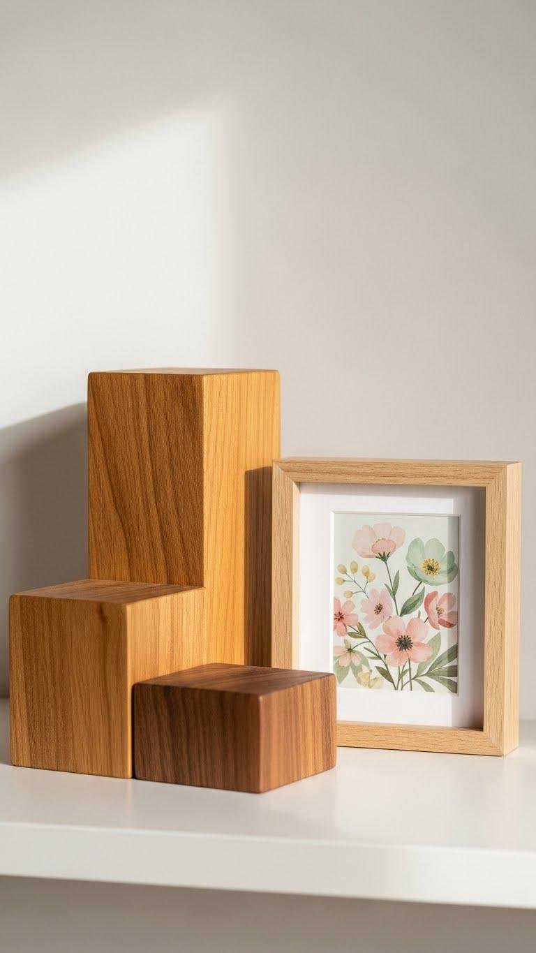 A trio of wooden risers arranged around a small floral picture lifts your shelf styling with layered warmth and intentional proportion; place the tallest riser behind or slightly to the side of the frame, the medium one adjacent, and the shortest in front to create a stepped silhouette that guides the eye.