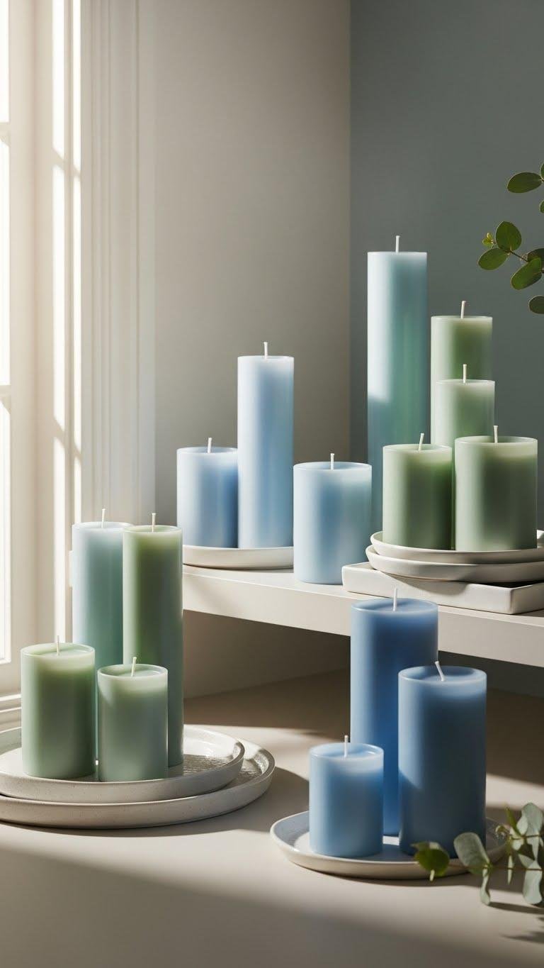 Place Magoa candles in varying heights on the top shelf to introduce a calm, coastal-inspired palette of blue and green that reads modern yet collected. You’ll arrange them with intentional color blocking, alternating hues to guide the eye. Layer with minimal ceramic trays, choose a subtle scent pairing like sea salt and eucalyptus, and let the display feel effortless and free.
