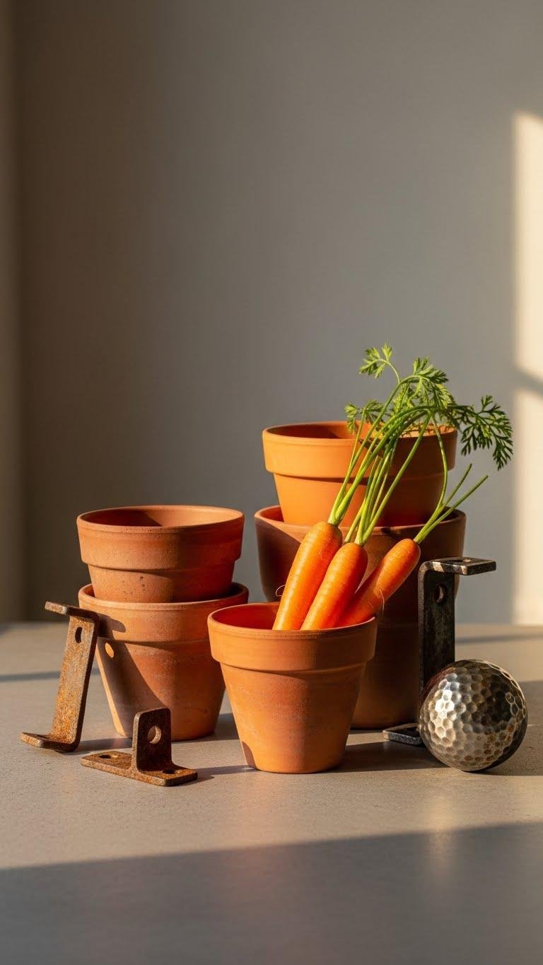 When you group three mismatched clay pots with a handful of fresh carrots and a few industrial metal accents, you create a balanced vignette that feels both rustic and modern. You’ll place terra cotta pieces at varied heights, tuck a carrot trio casually into one, and lean a patinated metal object nearby. The result reads intentional, free, and effortlessly chic.