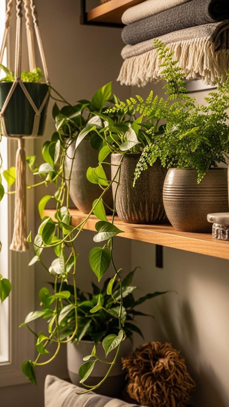 After you place that rustic trio, soften the scene by adding trailing pothos and feathery ferns that spill over the shelf edge—this brings movement and a lived-in freshness to the arrangement. You’ll hang a vintage macramé planter, layer textures, and prune for airy lines. Embrace simple humidity tips to keep leaves glossy, let vines roam freely, and curate a relaxed, modern vignette.