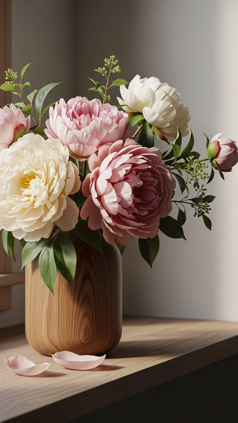 Bring in the soft drama of real touch peonies by tucking a handful into a simple wooden vase—its warm grain offsets the blooms’ lush, lifelike petals and keeps the look grounded and modern. You’ll mix silk stems with scented petals and soft greenery, choosing a minimalist vase scale.