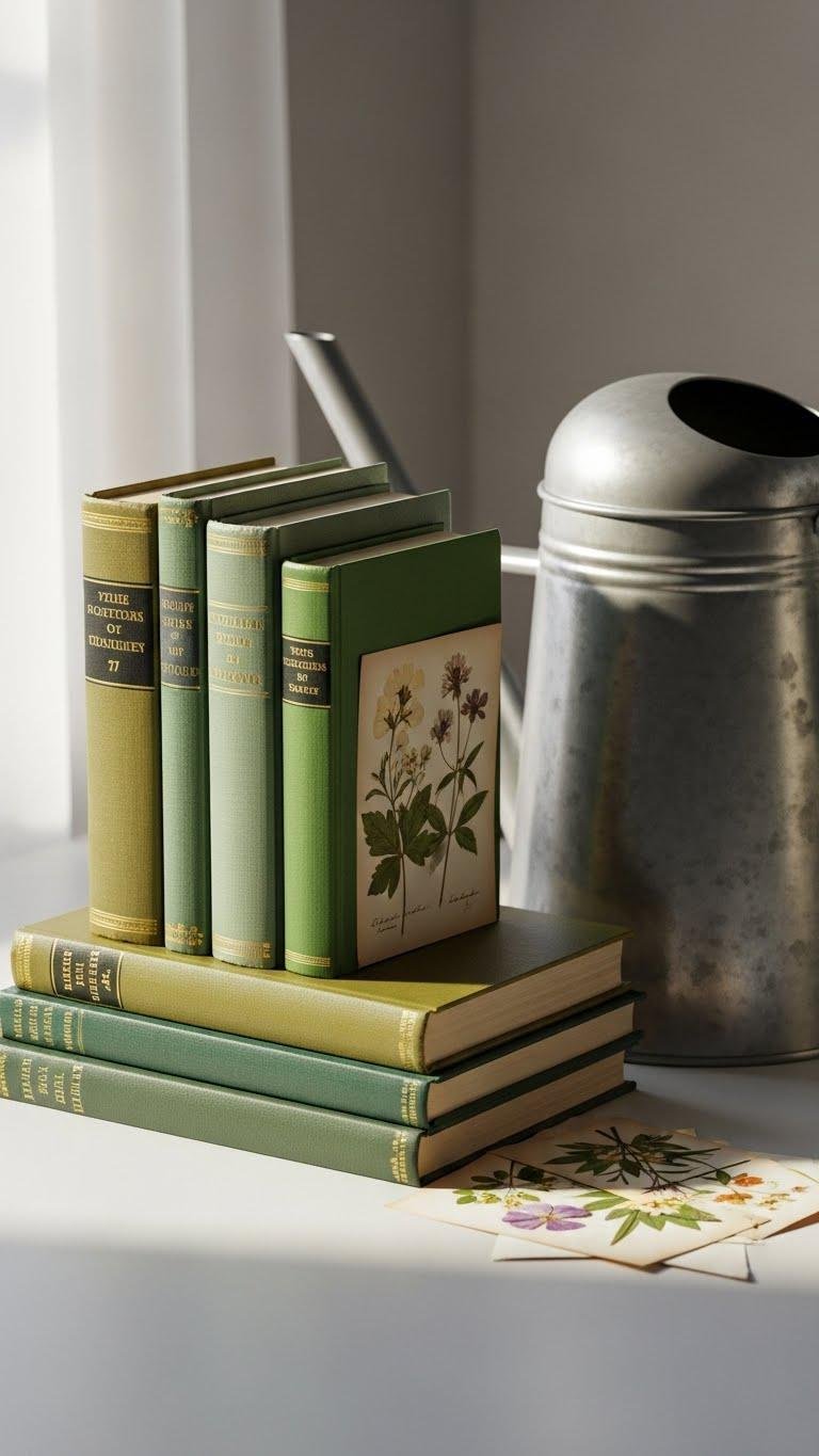 Pair them with a matte metal watering can for a chic watering can vignette that feels collected. Tuck vintage botanicals prints between volumes, keep spacing airy, and let the arrangement breathe—effortless, liberated, and carefully edited.