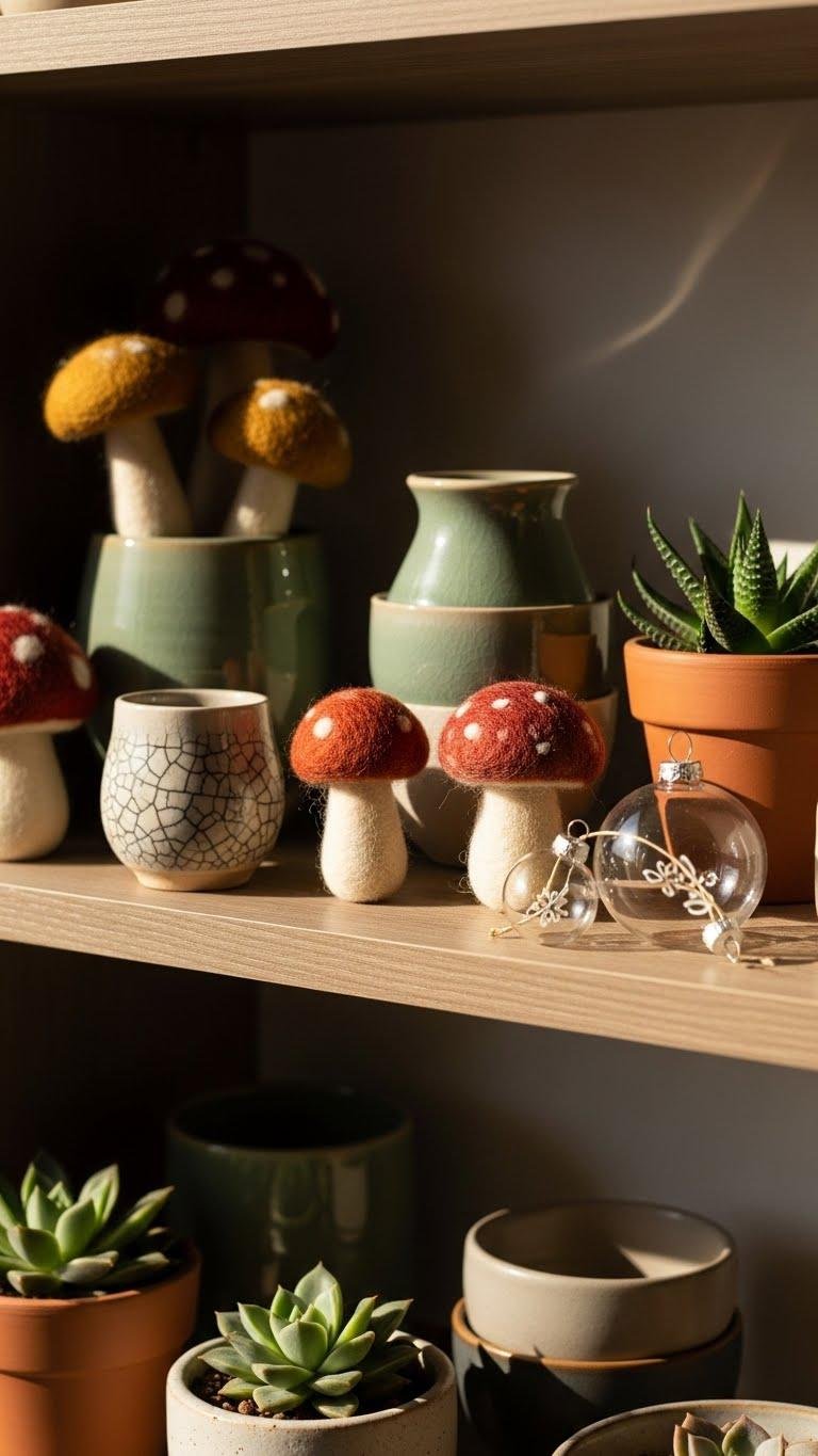 Tuck a few handmade ornaments from Etsy into your shelf display to add instant personality and artisanal charm—think tiny hand-glazed ceramics, felted wool mushrooms, or delicate blown-glass baubles that read like miniature art pieces.