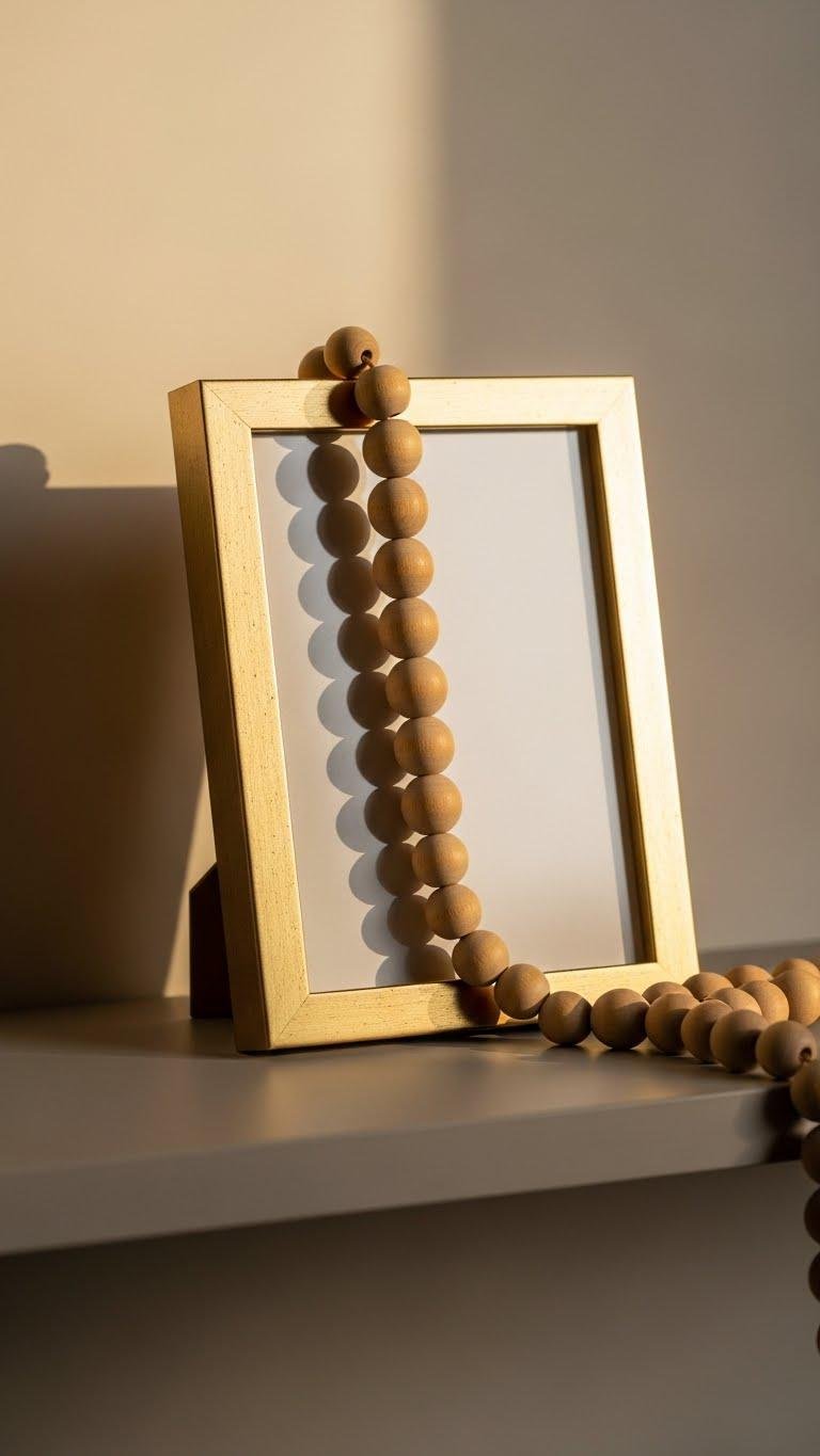 Try draping a strand of natural wood beads over a slim gold frame to introduce warm texture and modern contrast. You’ll appreciate how natural texture meets a neutral frame, creating bead contrast against metallic sheen. Arrange casually for simple elegance, letting beads loop asymmetrically. This curated, trend-aware touch feels unfussy and liberating, perfect for a shelf that breathes and invites movement.