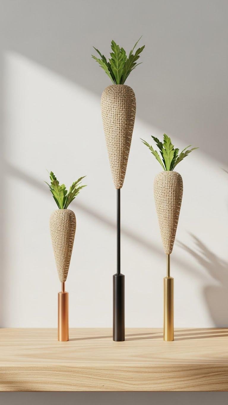 After the soft, organic feel of wood beads on a gold frame, bring in sleek metal forms paired with homespun charm to keep your shelf balanced and modern. You’ll place three metal accents—matte copper, black iron, brushed brass—each topped with a burlap carrot. The mix delivers rustic simplicity and textured contrast, letting you curate airy, liberated vignettes that feel intentional and unfussy.