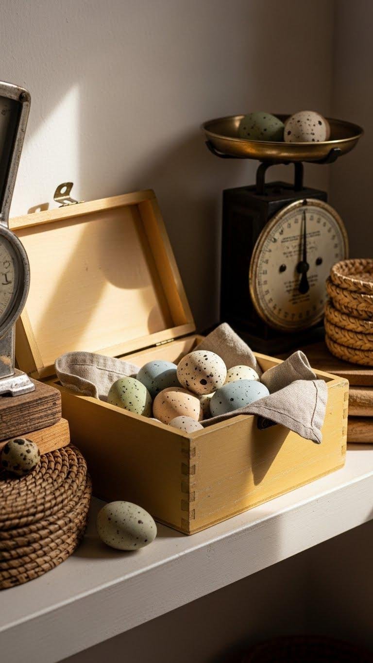Tucked into a low shelf nook, a sunflower-yellow cheese box becomes an instant focal point when you nest a small cluster of speckled spring eggs inside; the painted wood’s slightly distressed finish and soft patina read chicly vintage against neutral backdrops. You’ll place a yellow cheesebox with muted spring eggs, balance scale and texture, and let airy simplicity suggest playful, unconfined style.