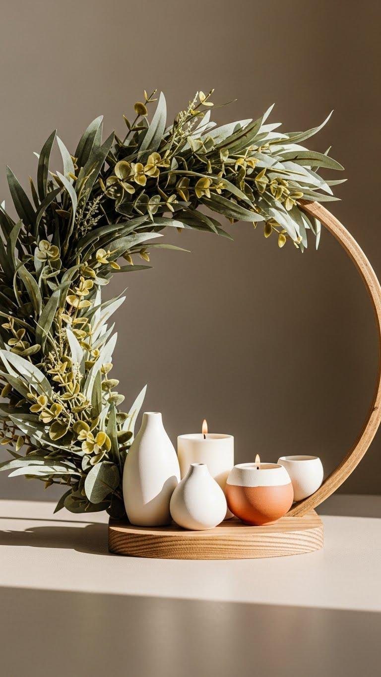 You’ll pair a rustic hoop with clustered greenery, small ceramics, and a low candle to craft layered simplicity. Arrange pieces with negative space, varied textures, and intentional gaps so the display breathes and invites spontaneous, unconfined living.