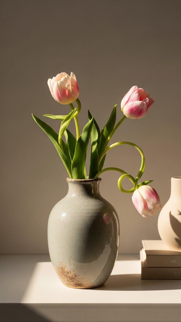 You’ll choose a piece with subtle distressed texture so light wear reads curated, not cluttered. Position the tulip trio slightly off-center, letting stem movement and negative space convey freedom and refined, on-trend ease.