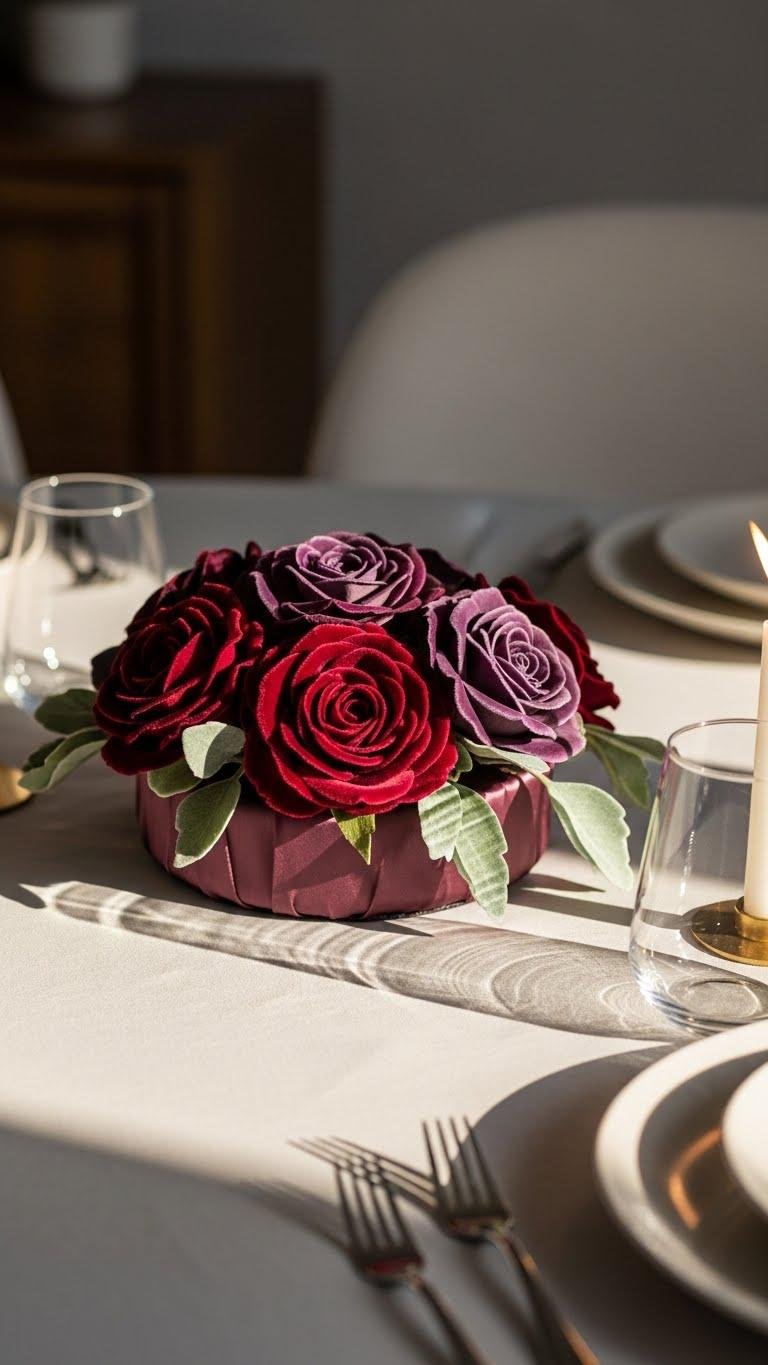 Set a sumptuous tone with a velvet rose centerpiece that anchors your dining table in luxe, tactile romance. You’ll pair silk prop roses with a compact satin base, choosing deep hues and pared-back greenery to keep the look modern.