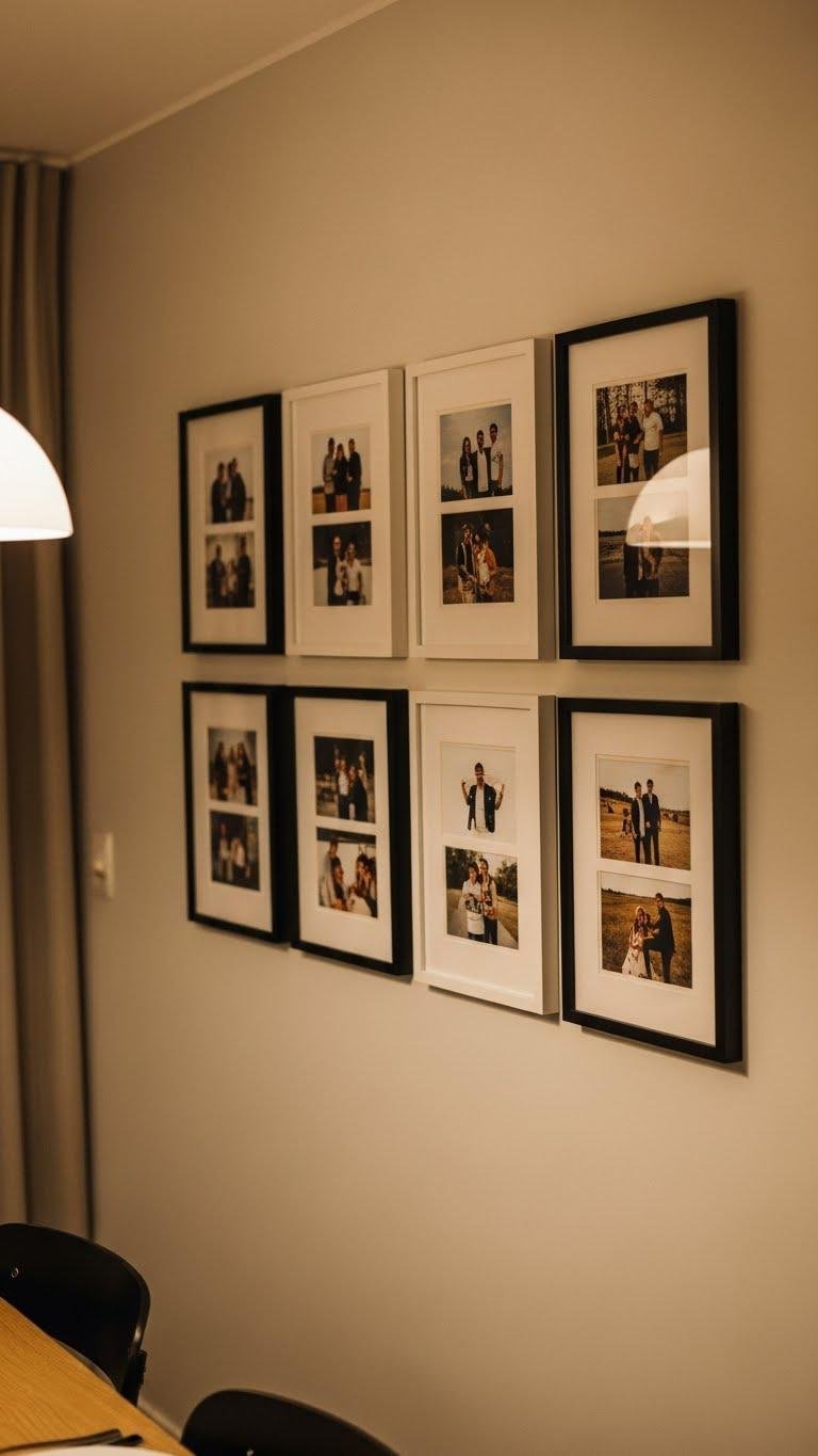 After a dessert grazing board that invites guests to linger, set a Memory Wall in uniform frames to keep conversations anchored and sentimental.