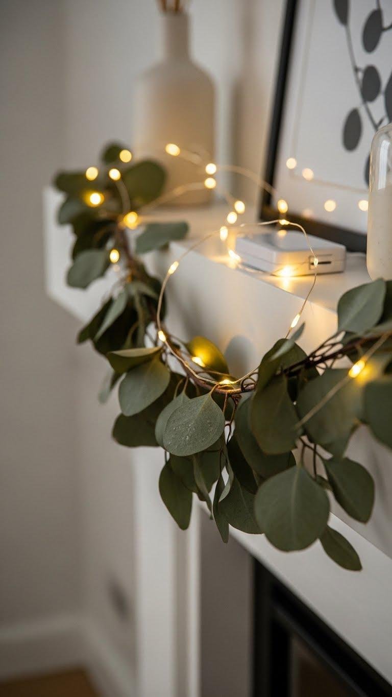 Climbing eucalyptus garlands with micro lights bring a soft, organic glow to your mantel, winding naturally and catching the eye without overwhelming the space. You’ll drape a wireless battery strand through woven stems, securing ends discreetly and adding a subtle scent.