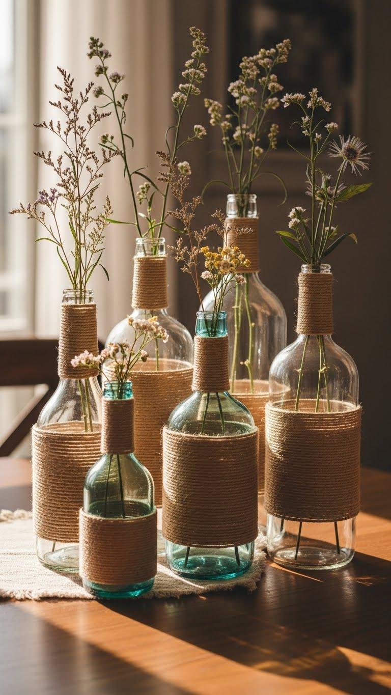 Once your gallery wall feels composed and intentional, carry that same curated restraint to the tabletop with repurposed bottles wrapped in twine as vases. You’ll choose clear or colored glass, bind necks with eco friendly twine, and cluster varied heights for balance.