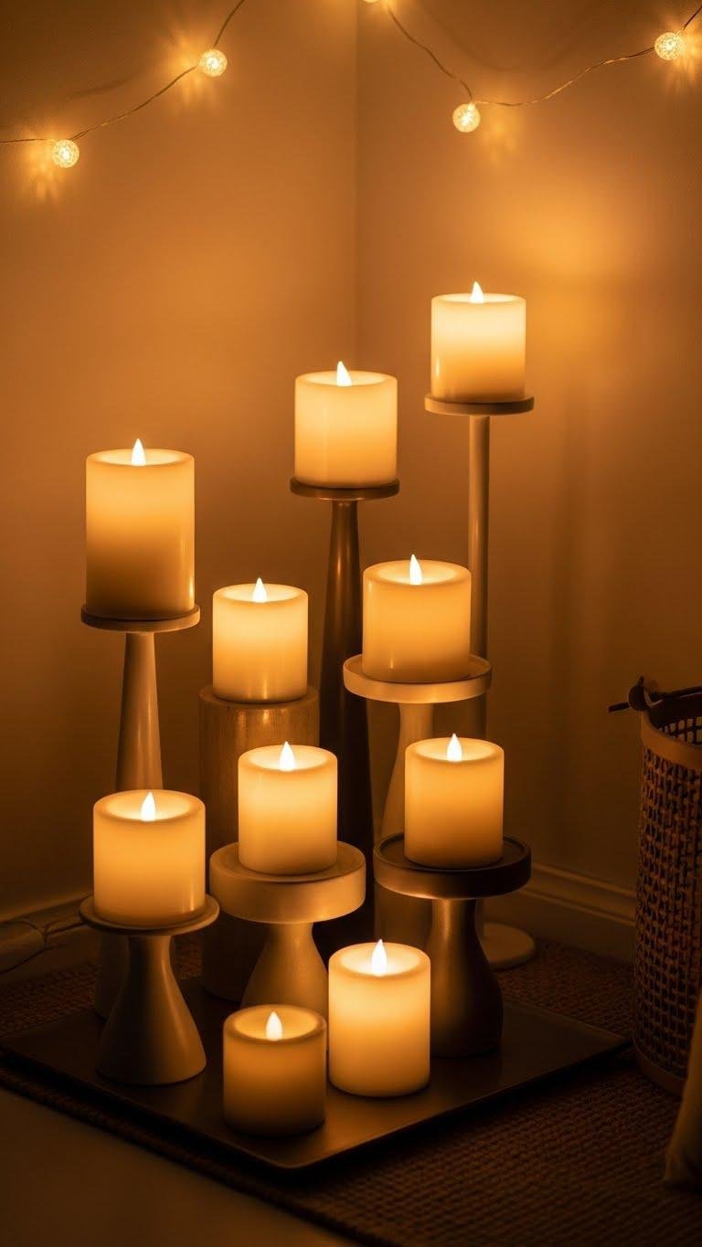 Carry the soft glow from your fairy-light canopy down to eye level by arranging grouped LED candles at varying heights—this brings warmth into corners and creates a layered, intimate focal point.