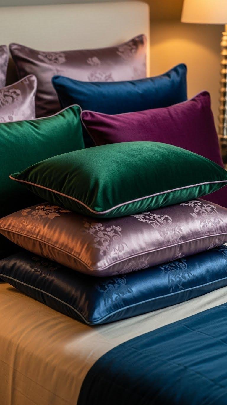 Layer velvet and satin throw pillows to create a tactile, luxe mix that instantly elevates your bed’s silhouette. You’ll pair rich colors and subtle patterns, choosing velvet piping for structure and a satin sheen for soft contrast. Arrange varied sizes, keeping a relaxed symmetry so the look feels curated, not precious, and lets your personal style breathe freely within the romantic scheme.