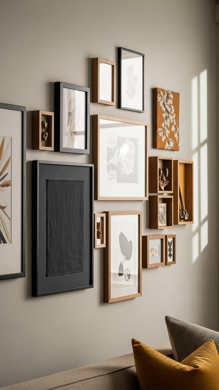 Start by mixing frames of different sizes, finishes, and materials to create a layered, curated look that feels intentional rather than haphazard. You’ll embrace mixed media, pairing prints, textiles, and found objects in an asymmetrical layout that breathes. You’ll place pieces to respect negative space, prioritize flow, and keep the arrangement feeling liberated, contemporary, and perfectly attuned to your room’s rhythm.