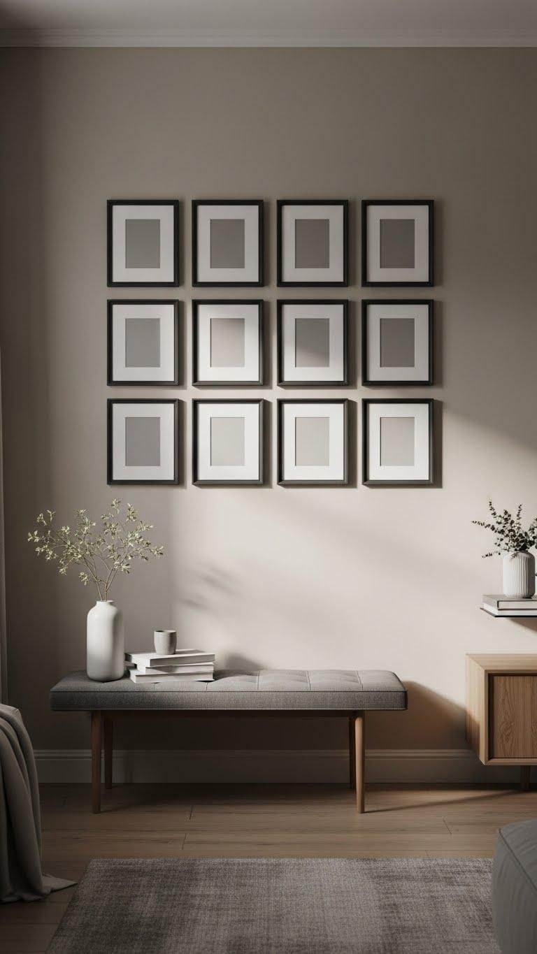 You’ll arrange identical frames in measured rows, honoring family symmetry while creating visual breathing room. Framed balance anchors a living room or hallway, inviting you to edit, rotate images, and enjoy a restrained, freeing aesthetic that feels modern and intimately yours.