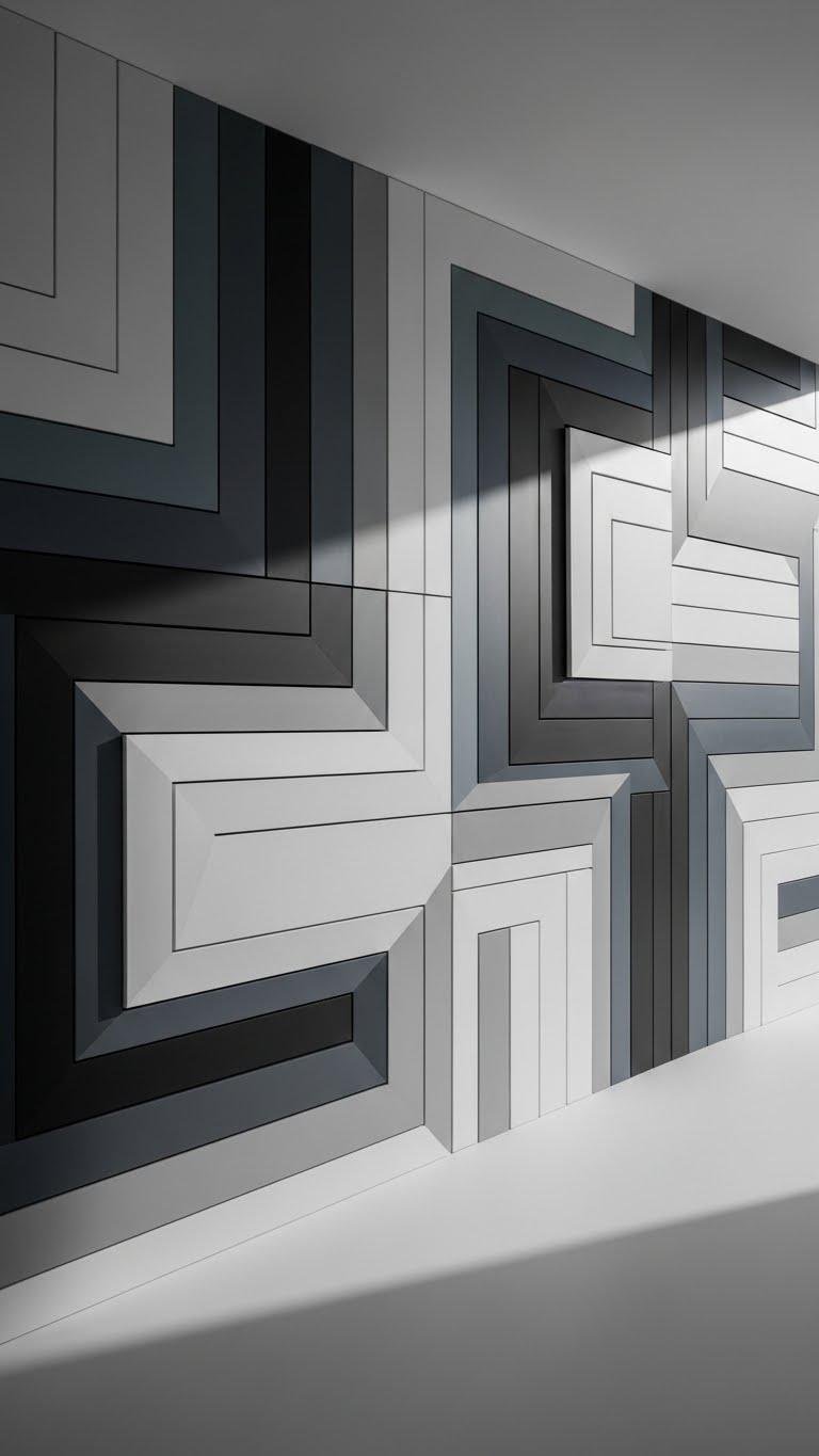When you step back, an optical-illusion mosaic pattern can seem to breathe and shift, turning a flat wall into kinetic architecture that plays with depth and perspective.