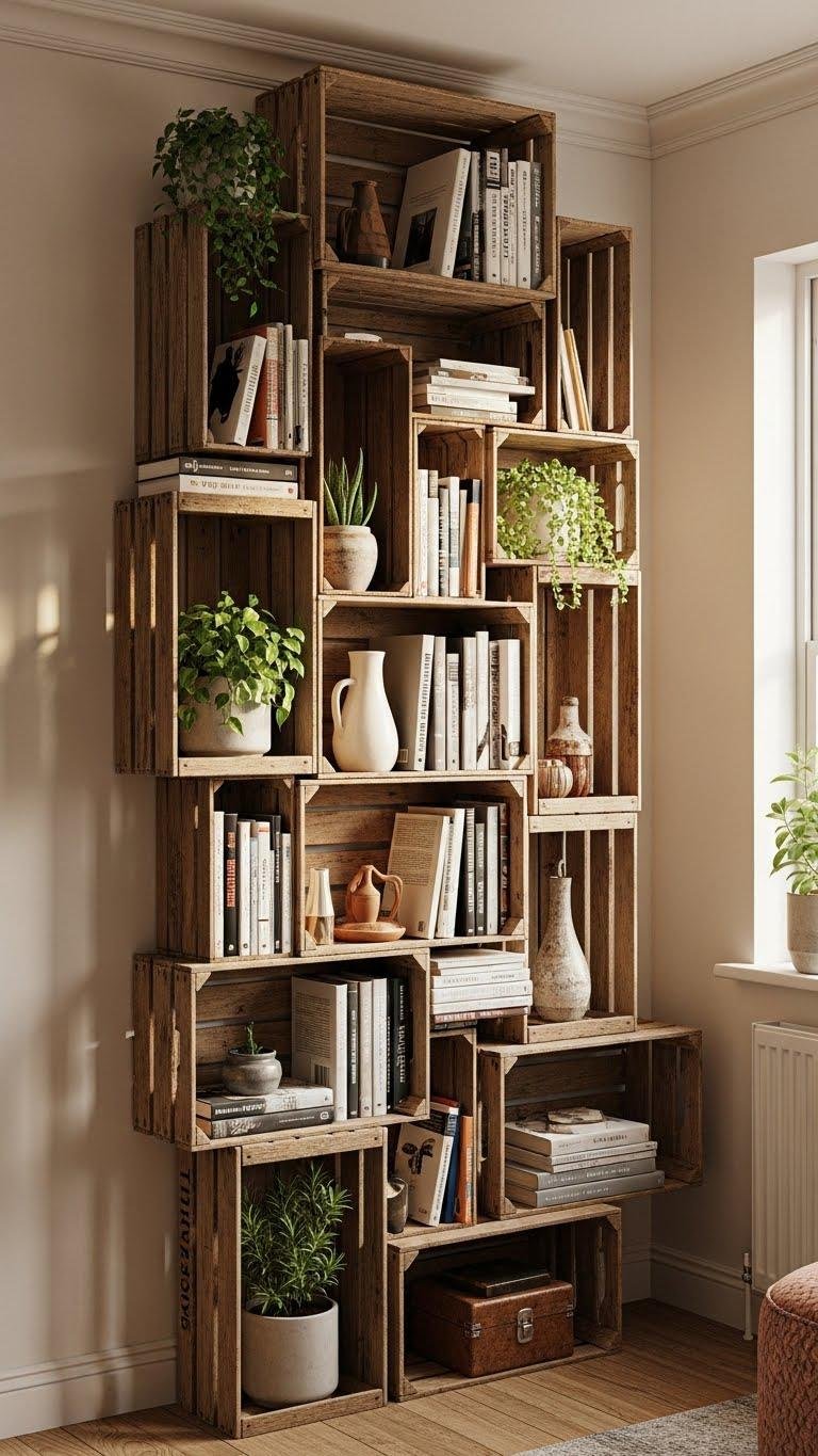 Think of a repurposed crate bookshelf wall as a sculptural patchwork that both economizes space and adds instant character to a room. You’ll mount salvaged pallet crates in staggered grids, creating vertical cubbies for books, plants, and travel finds. This modular, free-spirited display maximizes narrow walls, invites rotation of objects, and celebrates reclaimed materials while keeping your space airy and intentionally curated.