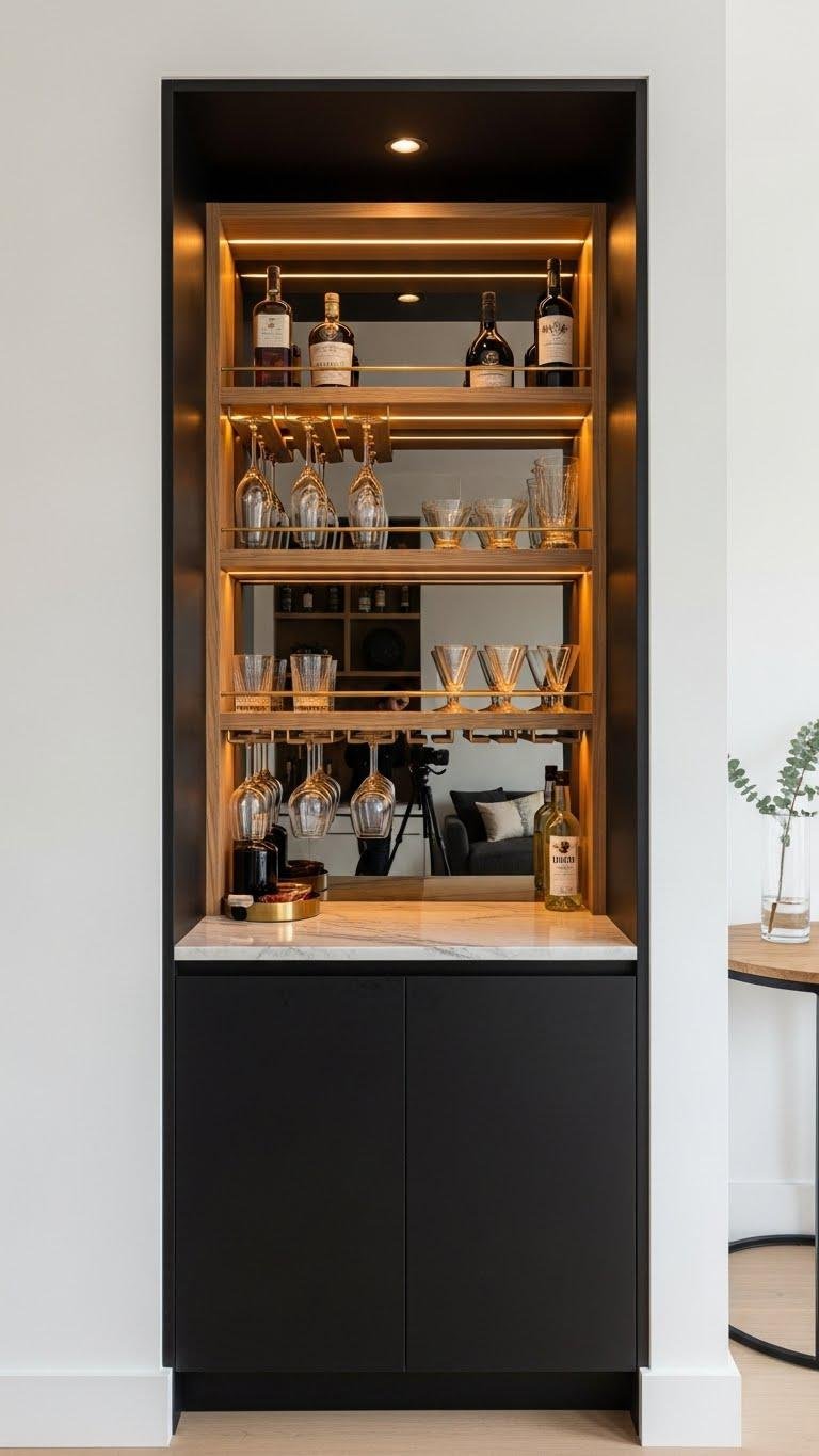You’ll craft a sleek built in minibar with glass racks, mood lighting, and alcove shelving that maximizes storage without crowding.