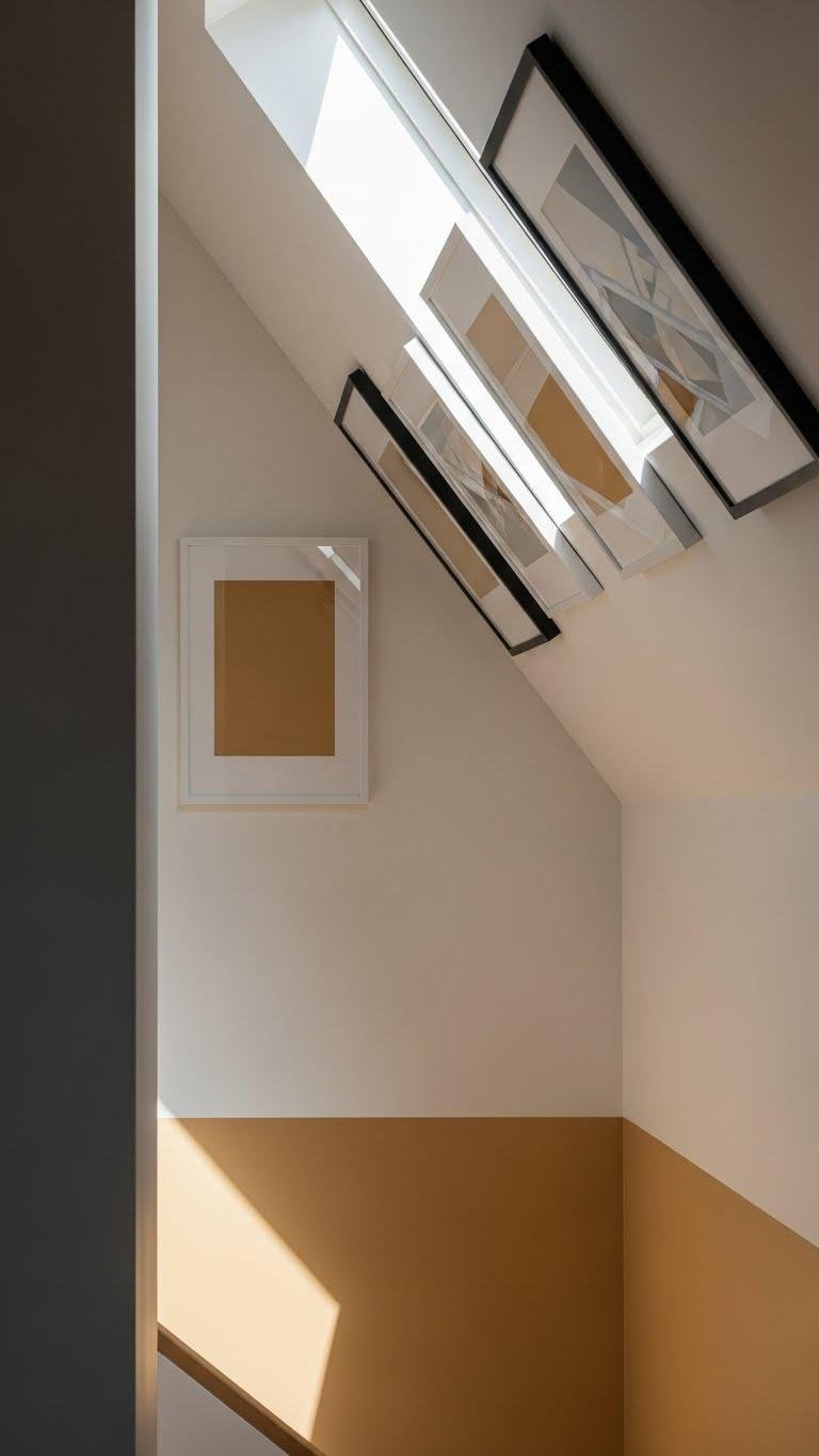 Lean into the slope by staggering frames to follow its angle, turning an architectural quirk into a compositional advantage.