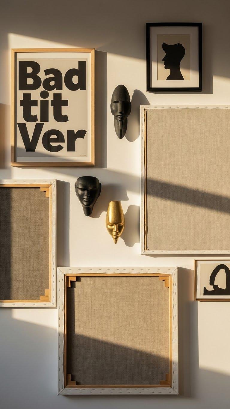 When you combine prints, canvases, and sculptural pieces, you create a layered conversation on the wall that feels curated rather than contrived. You’ll play with texture juxtaposition and sculptural silhouettes, mixing bold graphics, soft canvases, and three-dimensional accents. Let negative space breathe, arrange pieces with deliberate gaps, and trust instinct—this eclectic collage celebrates freedom, personal rhythm, and modern, artful balance.