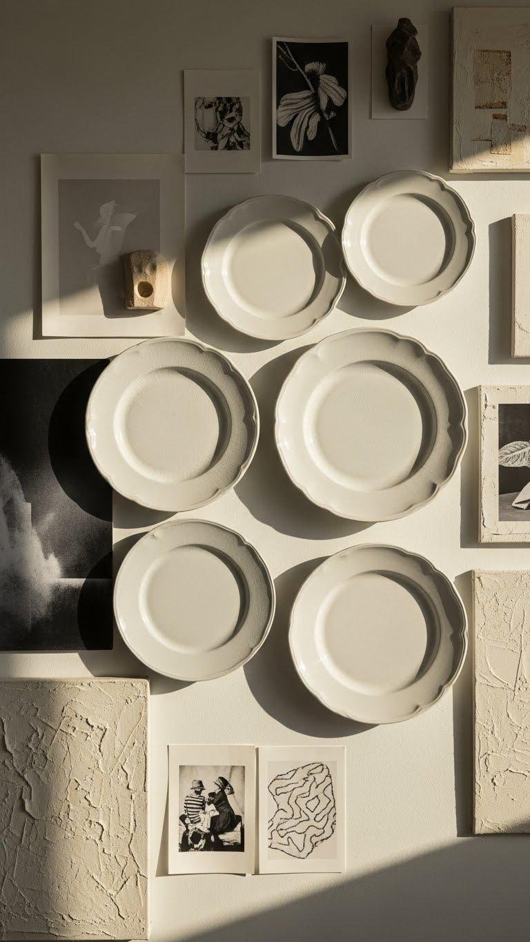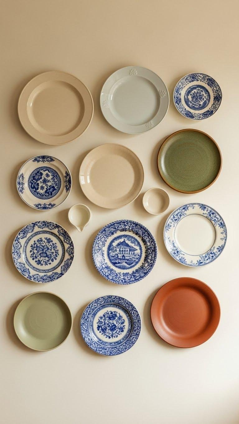 Mixing prints, canvases, and sculptural forms sets the tone for bringing in a collection of ironstone plates, which add soft curves and vintage texture to your gallery without competing with bolder pieces.