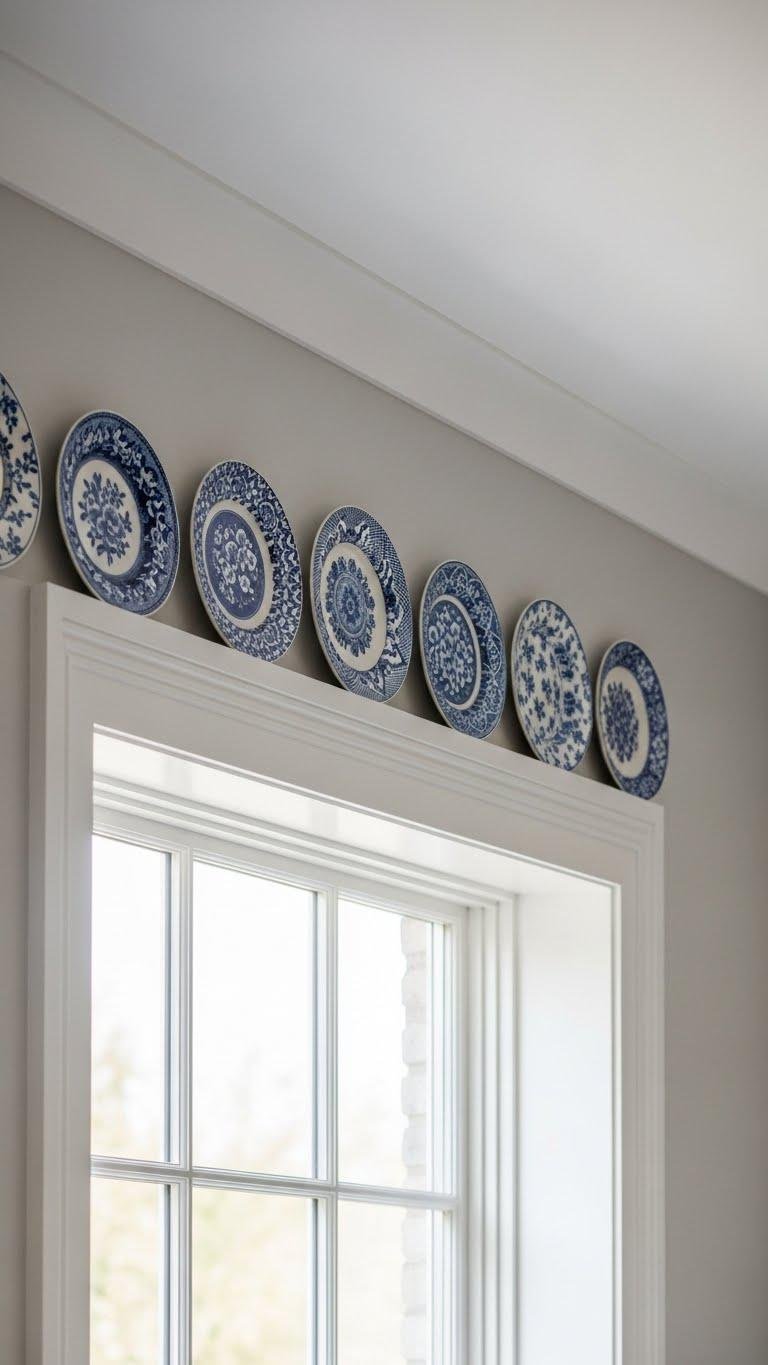 Line a row of blue-and-white plates above your window to draw the eye upward and give the room a crisp, architectural finish.