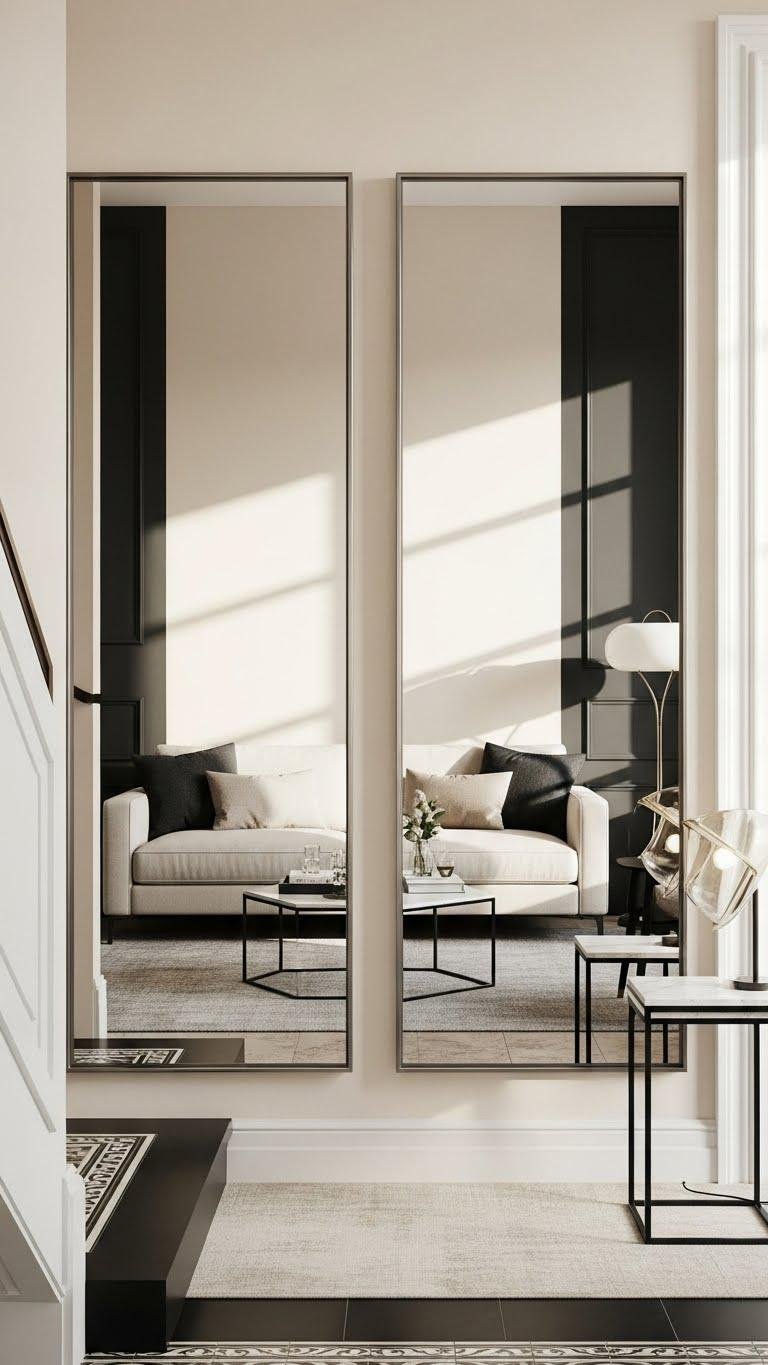 After anchoring a stairwell with patterned tile, bring that same sense of rhythm and scale to your living room by flanking the sofa with a mirrored pair. You’ll amplify light and create reflective symmetry that expands the space.