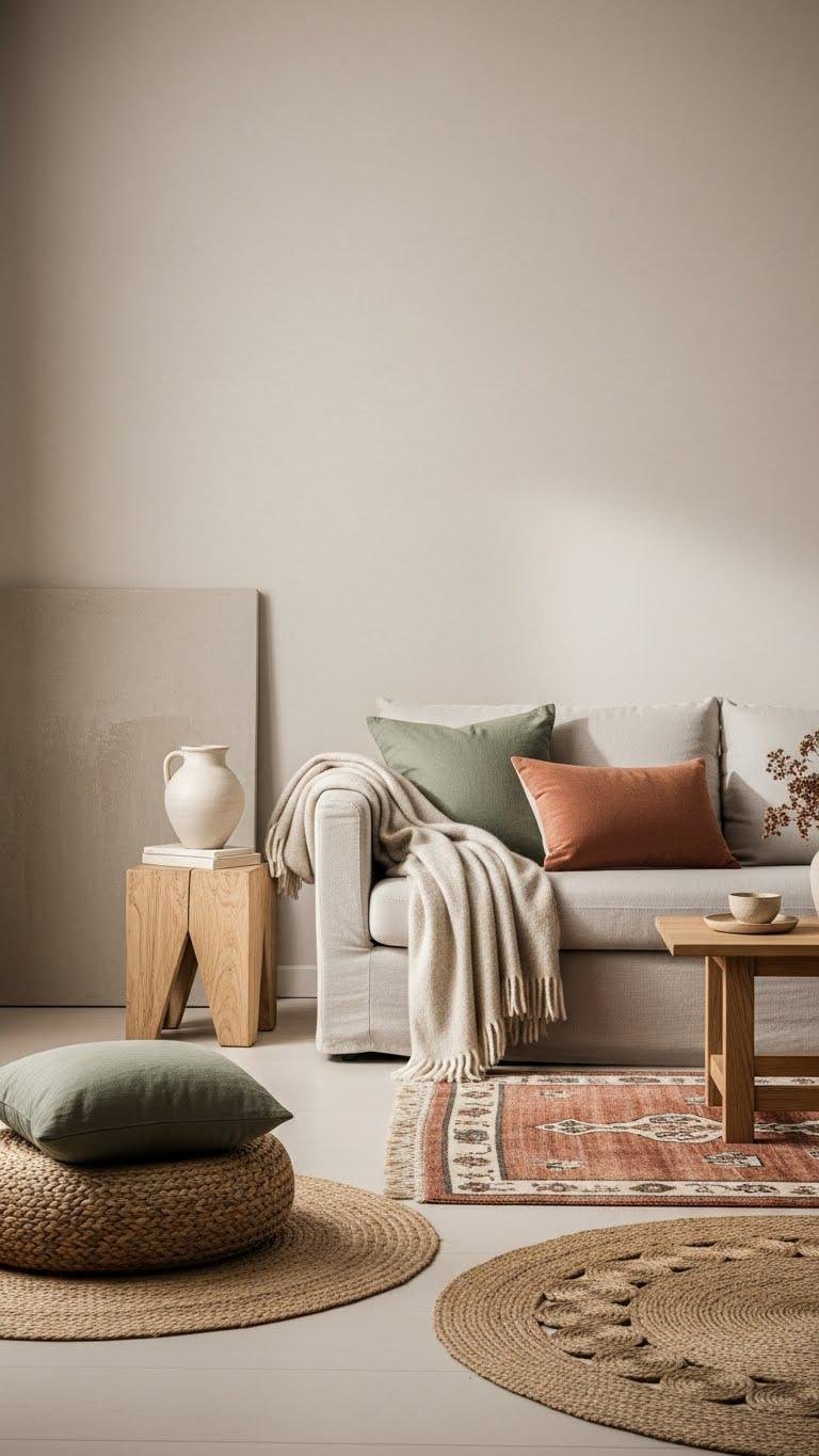 You’ll pick one or two muted accents—sage, terracotta, or dusty blue—and let them recur in cushions, art, and a single rug.