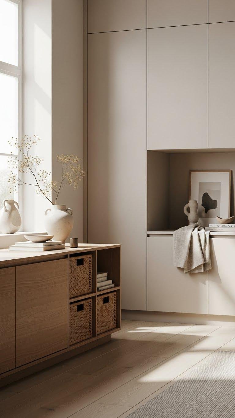 When you want surfaces to feel intentional and uncluttered, rely on closed storage to tuck away the everyday — baskets, low credenzas, and built-in cabinets keep visual noise out of sight while preserving a warm, minimalist look.