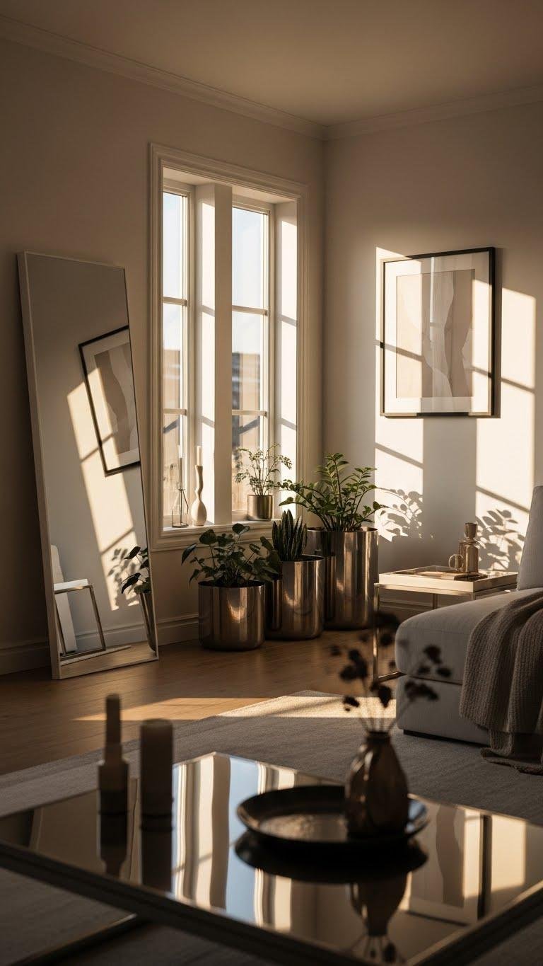 Position reflective art opposite windows, lean a slim mirror to catch low sun, and group metallic planters near light sources.