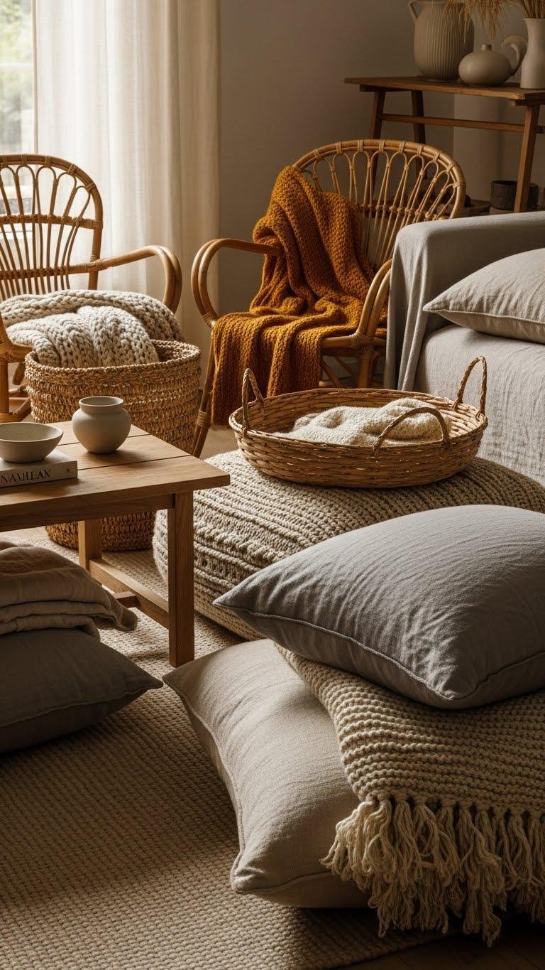 If you want a room that feels lived-in and luxe, start stacking textiles that contrast in weight and weave—think a chunky wool throw over a linen sofa, a low-pile sisal rug topped by a plush sheepskin, or a raw-edge cotton blanket folded at the foot of a bed.