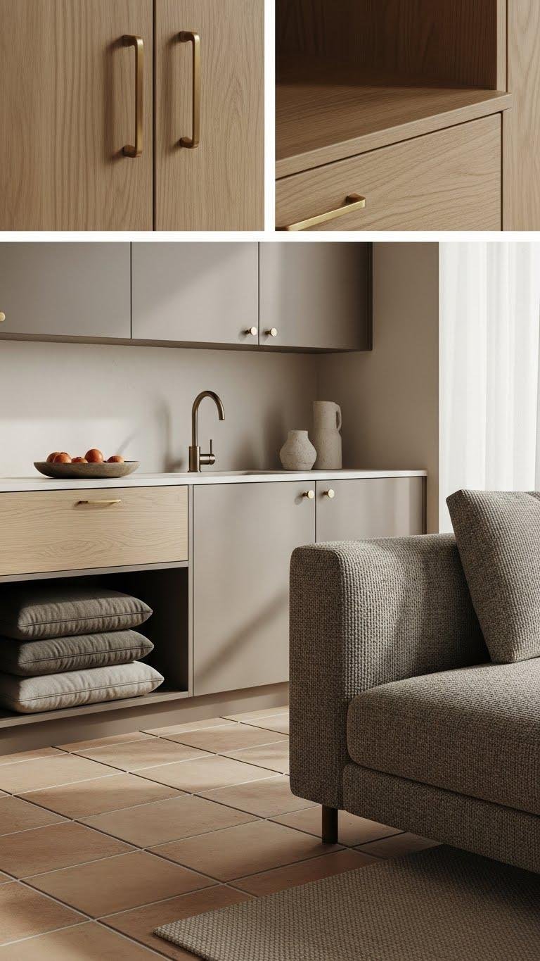 Choose finishes that invite touch and stand up to life: matte lacquered cabinetry, kiln-fired tiles, and tightly woven upholstery keep a warm minimalist space looking effortless while feeling good underhand.