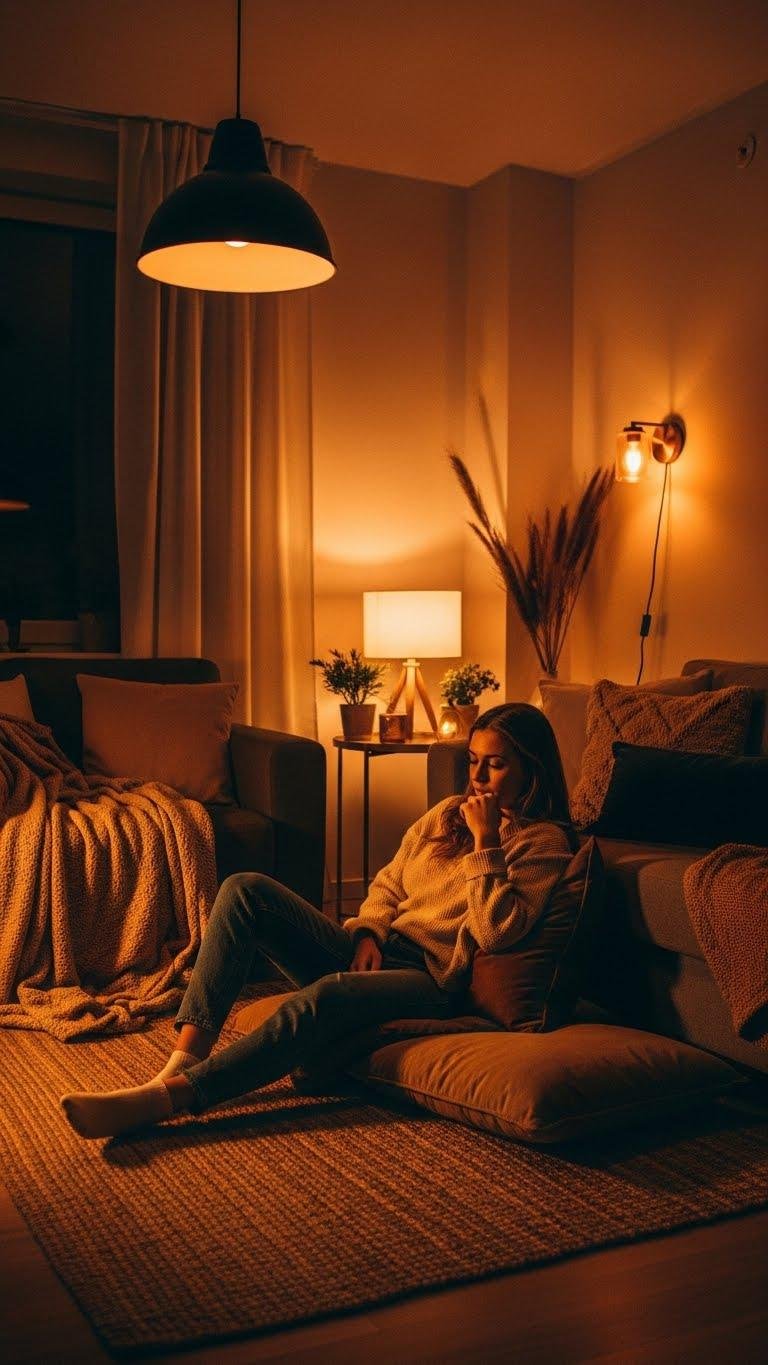 [IMAGE PROMPT: A cozy, photorealistic interior of a small apartment living room in winter, bathed in soft, diffuse warm light from paper pendant lamps, frosted globe ceiling fixtures, fabric-shaded floor lamps, and wall sconces. Neutral, warm color palette—creamy whites, soft grays, muted ochres—with layered lighting creating gentle shadows and depth; visible dimmer switches and subtle glow zones that define calm seating nooks. Composition focuses on ambient layering and texture (plush throws, wooden side tables, potted plants), conveying a serene, inviting mood and personal freedom.]