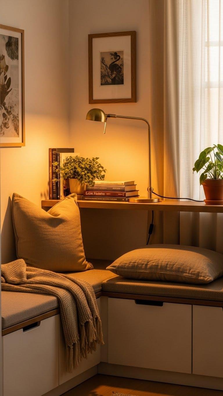 Now that your lighting bathes the space in amber warmth, carve out a spot that makes you want to sit and stay. Claim a reading alcove — tuck a slim shelf, plant, and task lamp near a window seat. Keep lines clean, textiles minimal but tactile, and storage smart. You’ll have a liberated corner for pages, daydreams, and slow mornings.