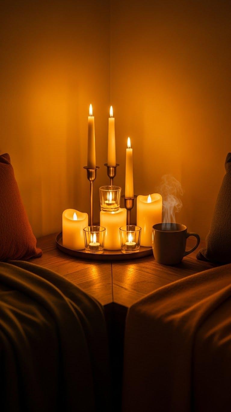 After you’ve set up a cozy hot drink corner, bring that same warm mood into the rest of your space by arranging candles in thoughtful clusters. Mix tapered, votive, and LED flameless pieces for layered height and texture. Prioritize candle safety with sturdy holders and trimmed wicks; use flame alternatives where needed to keep freedom to relax without risk or fuss.