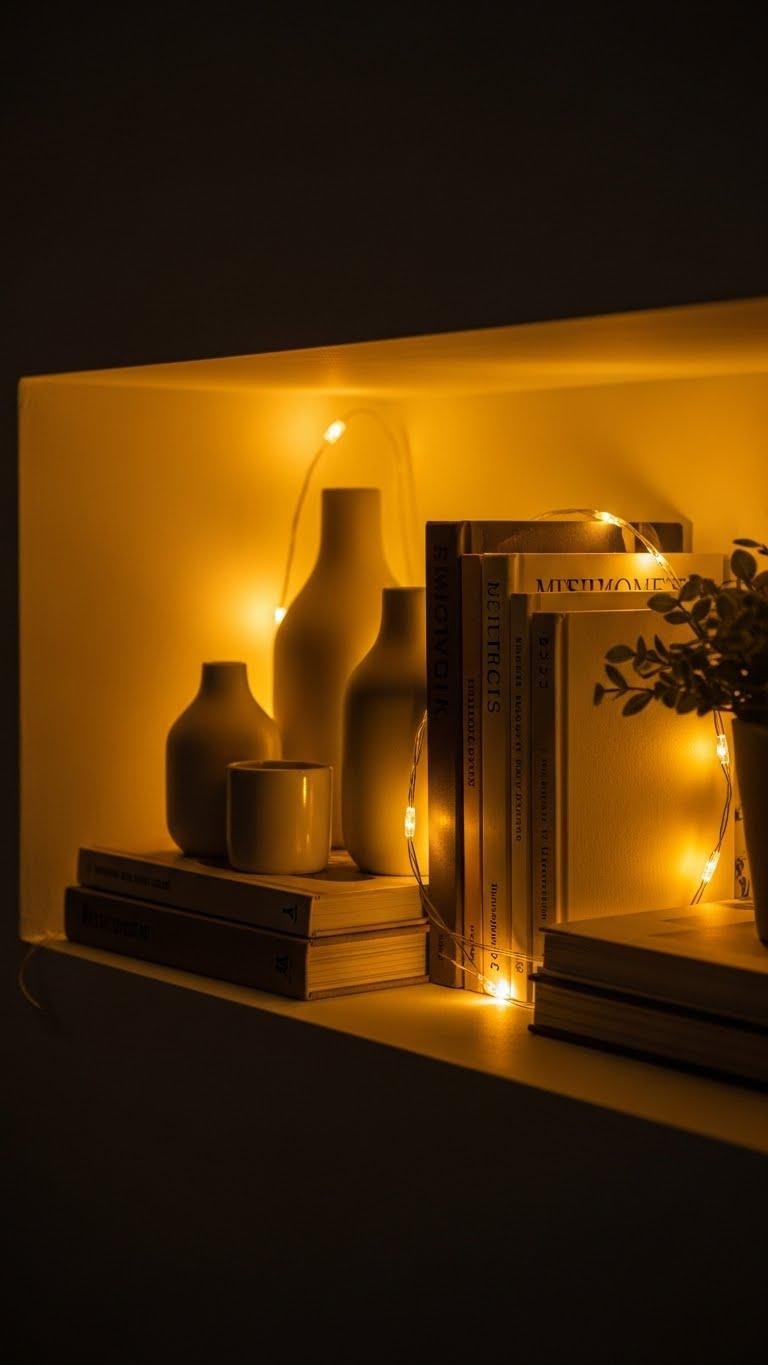 Install Soft String Lights in Alcoves or Shelves